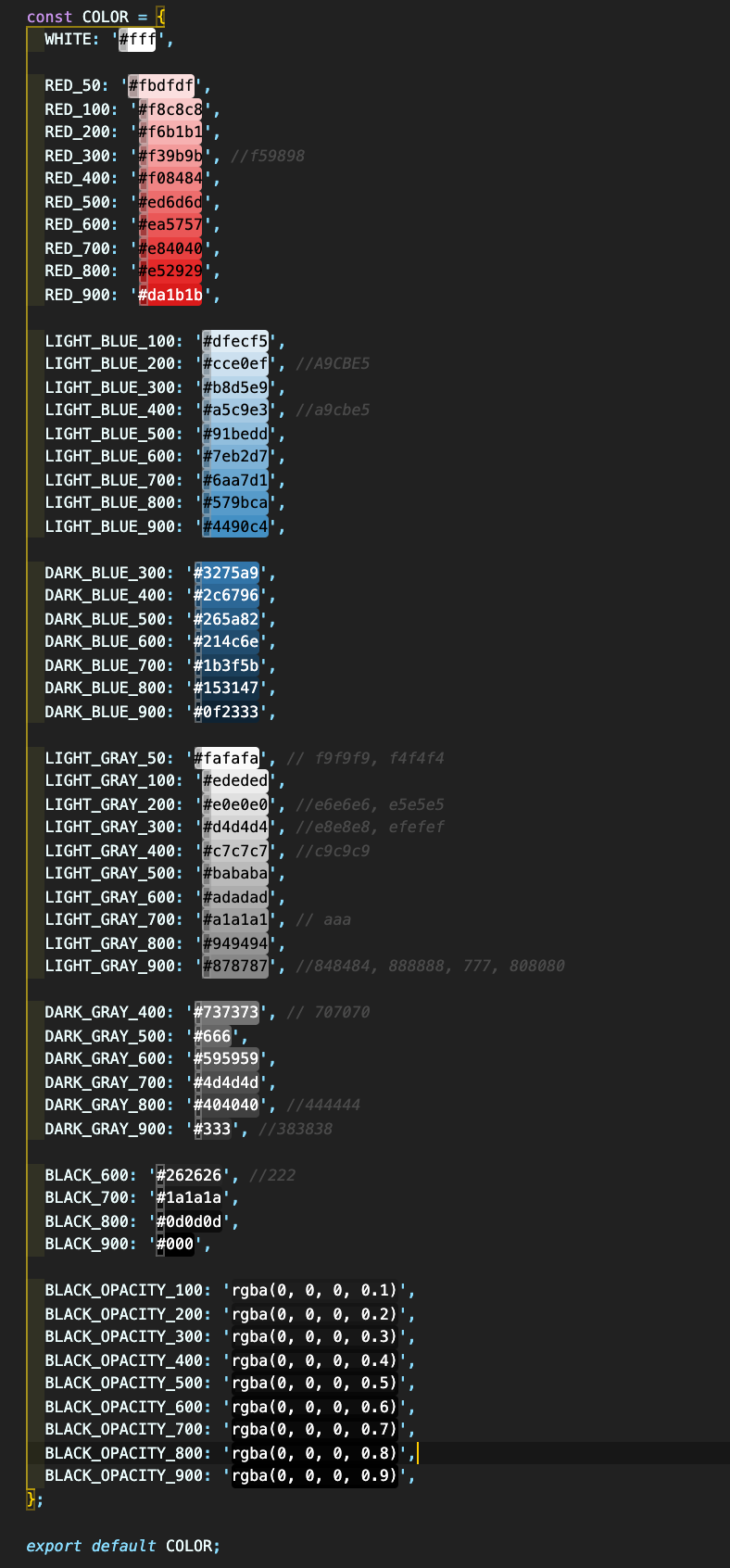 이렇게 해서 만들어진 Color.js 파일은 아래와 같다. 주석처리가 되어 있는 부분은, 기존의 색들을 모두 포함할 수 없어서 입력된 색으로 통합했다는 의미다. 이렇게 보니 정말 많은 색들이 통일성을 가질 수 있게 된 것 같아서 뿌듯..!!