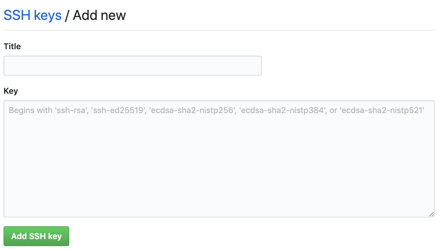 그리고 나서 오른쪽 상단에 보이는 New SSH key를 선택하고 title에는 원하는 이름을 넣고, 4번 vi에서 복사한 내용을 Key에다가 붙여넣어 줍니다.