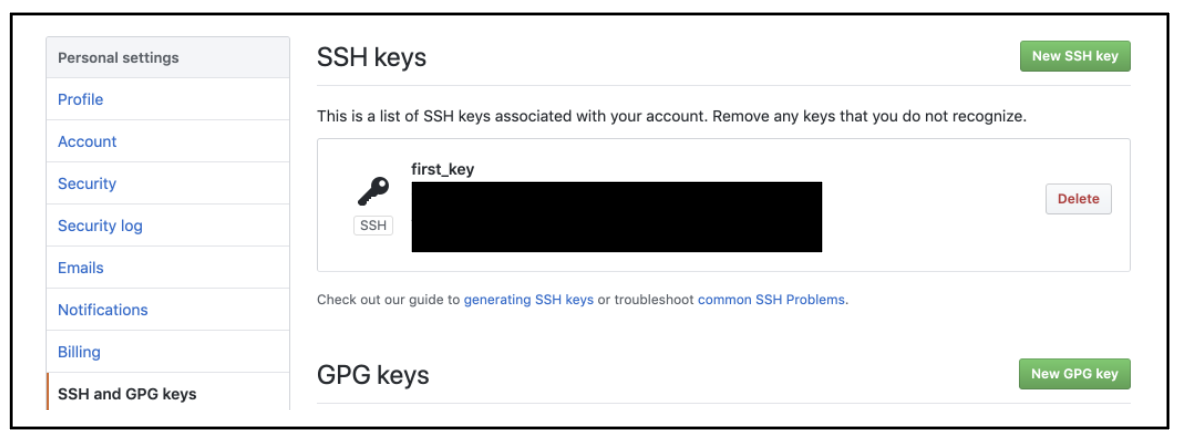 먼저 github.com에 가서 로그인을 하고 Settings에 가서 SSH and GPG keys 메뉴로 들어가세요.